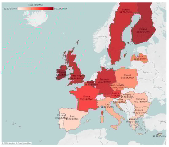 EU map LCOE (EUR/MWh)—fixed-axis PV modules (source: own elaboration with Open StreetMap layer [46]).
