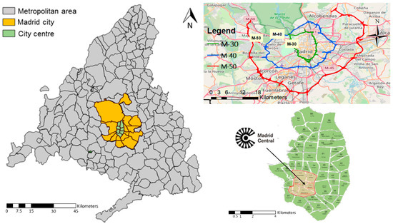 The metropolitan area of Madrid has an extensive road transport network, including ten main highways. In particular, there are three main beltways around Madrid City (M-30, M-40, and M-50) connecting different municipalities within its metropolitan area (Figure 1). These beltways typically define, in practical terms, the different geographical areas within the metropolitan area of Madrid.