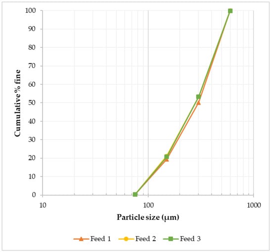 Feed material (historical tungsten tailings) particle size distribution in three samples, showing similar distributions.