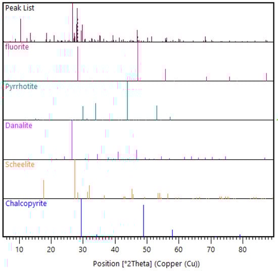 The feed material used was historical tungsten tailings samples collected from the Smaltjärnen TSF in Yxsjöberg, Sweden, estimated to have about 2.2 million tons of tailings, and covering an area of 26 hectares [27]. In this study, 26 g of the tailings sample was used for each experimental run based on the ball-to-powder ratio (BPR) of 50 [12], with the particle size distribution of −600 to +75 μm (Figure 1), and an average density of 3.35 g/cm3 determined using a He pycnometer. Particle size distribution was conducted on three different tailings samples using dry sieving in five size fractions (>600 μm, −600 to +300 μm, −300 to +150 μm, −150 to +75 μm, and <75 μm). Chemical analysis was conducted using the inductively coupled plasma–sector field mass spectrometry (ICP–SFMS) method, while the bulk mineralogical phases in which the high concentration elements were hosted were determined using X-ray diffraction (XRD) (Figure 2). In order to find the mineral phases of interest in the tailings using XRD, prior knowledge of the mineral composition of the primary ore from which these tailings were generated was essential [29]. This is because, for minerals like scheelite with very low concentration in the tailings, finding them in the XRD candidate list was only possible by using restrictions when executing the “search and match” function in the HighScore Plus software. The element of interest in this study, W, was among the minor elements (Table 1), while the feed material’s major elemental composition was CaO, Fe2O3, and SiO2 (Table 2).