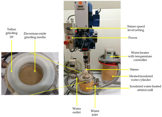 Leaching experiments were conducted in an insulated water-heated attritor mill with different parameters (Figure 3 and Table 3). Sodium hydroxide (NaOH) at 10 M, with an average pH of 13.56, was used to digest the tailings samples [24]. The liquid/solid ratio factor, temperature, digestion time, and stirrer speed were other factors investigated in this study to assess their effect on the W recovery from historical tailings in the LWG process. For the leaching procedure, experiments were designed using the Design-Expert® software (12.0.12.0, Stat-Ease, Minneapolis, United States, 2020). The regular two-level factorial design was picked because of its effectiveness in “screening through many factors to find the critical few”, and the two-level full factorial was employed as it “permits estimation of all main effects and all interaction effects” [30].