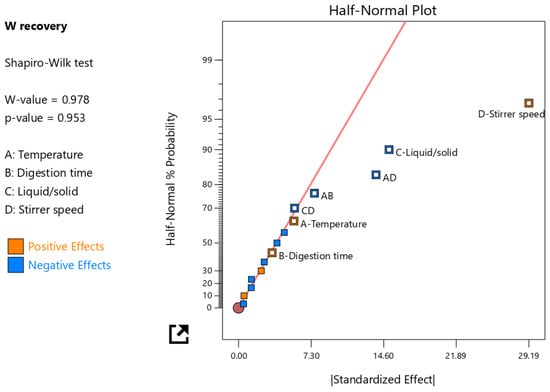 The concentration of W in the leachate was used to calculate the W recovery (main design response) from the tungsten tailings (Figure 4). The experiment design was evaluated on the reduced two-factor interactions (2FI); the four main factors (A, B, C, and D) and three 2FI (AB, AD, and CD) terms were identified as significant factors, which were separated from the insignificant effects using the half-normal plot method (Figure 5). It was observed that the stirrer speed (D), temperature (A), and digestion time (B) had positive effects, meaning an increase in these main factors would increase the W recovery. The stirrer speed had the largest contribution of 58.5% because it relates to the particle size reduction, increases the surface area, and enhances the reactivity of scheelite [10,23]. It also enhances mass transfer in the highly viscous NaOH digestion solution and continuously removes the Ca(OH)2 solid product layers that form on scheelite mineral particles as the accelerated rate-determining chemical reaction (Equation (1)) proceeds [5,13,21,22].