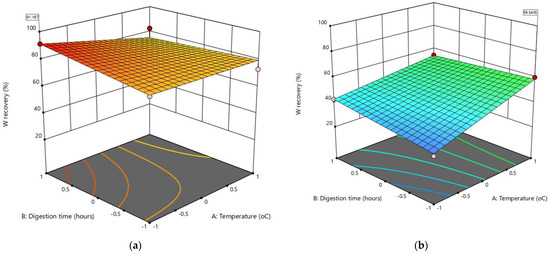 The 3D response surfaces for the best optimization solution to maximize W recovery from historical tungsten tailings using the leaching while grinding (LWG) process: (a) liquid/solid ratio (C) = −1, stirrer speed (D) = 410 rpm, and (b) C = −1, D = 205 rpm.