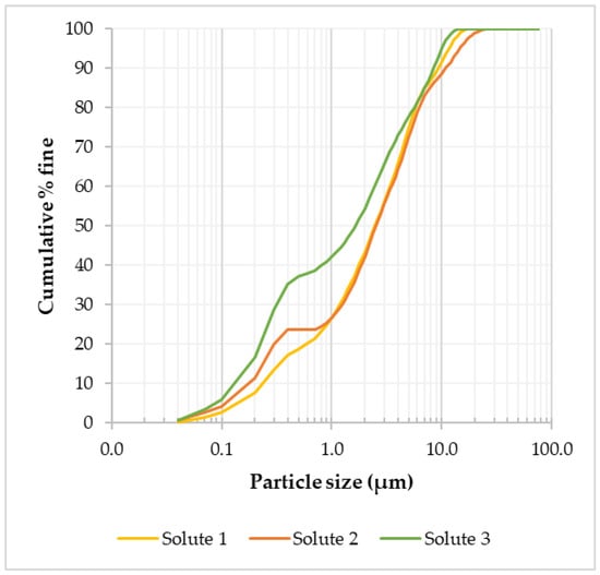 In order to assess the effect of grinding on particle size, the residue (solute) from the optimized LWG of the tailings was analyzed using laser diffraction for particle size distribution. Since the feed material particle size distribution was –600 to +75 μm, it was important to assess the amount of material that ended up in the fine (<75 µm) fraction after grinding. From mass balancing, 55.4 wt.% of the ground tailings material was <75 µm, and this fraction was analyzed using laser diffraction. Based on the three solute samples analyzed, it was observed that the average particle diameter at 80% was 5.85 µm (Figure 8), meaning a substantial reduction in particle size had resulted from the grinding.
