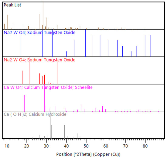 For the bulk mineralogical characterization of the solute, XRD was used to determine in which phases the unleached W occurred. It was observed that W was present in both the Na2WO4 and CaWO4 phases (Figure 9), meaning further dissolution, achieved by increasing the duration of washing, was required to solubilize the Na2WO4 for W to be totally recovered from this phase. For the W in the CaWO4 phase, further analysis using scanning electron microscopy (SEM) would be required to determine if the CaWO4 remained unliberated in the coarse (>75 µm) fraction, or if it resulted from the reverse reaction occurring because of the over-dilution of NaOH in the washing stage.