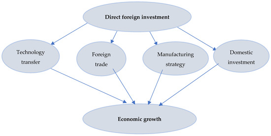First, there is foreign direct investment and its relationship to economic growth. Among the most important studies that focused on this aspect, Richardson’s (1997) study concluded that foreign direct investment had a major role in stimulating economic growth in Southeast Asian countries through its role in increasing the total productivity of the factors of production using the accompanying modern technology, as well as its role in increasing the exports of these countries and the availability of skilled labor in the host countries. The foregoing leads to an increase in economic growth rates by contributing to the growth of productivity and exports in the host countries [30]. However, it is noted that these effects differ according to the characteristics of the industry and the political environment in each host country separately. The same previous effect occurred in terms of the effect of increasing the rate of economic growth in Cameroon due to positive external influences, while Hoekman and Djankov found the same effect as before when applying to Czechoslovakia. Testing the data used from 12 Asian economies during the period from (1987–1997), it was found that the total foreign direct investment flows affect economic growth significantly. As for the classification of the types of flows that entered these economies, it was found that foreign direct investment, only in the manufacturing sector, does have a large and positive impact on economic growth and the characteristics of this effect are the positive contribution to the side effects of foreign direct investments [31]. Moreover, the study by Elkomy et al. (2020) examined the main role of foreign technology in the growth of domestic productivity in Egyptian manufacturing industries during the period 2006 to 2009, and the study concluded that only technologically intensive industries in Egypt have the absorptive capacity to effectively absorb foreign technology [32].