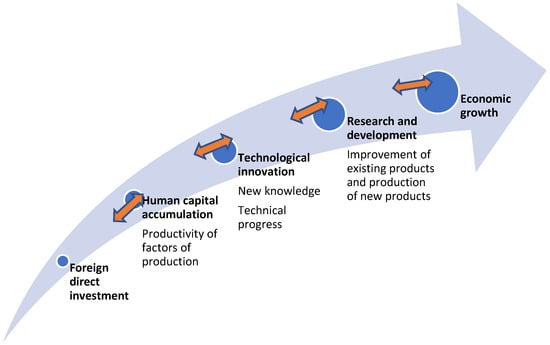 Third, there are studies on foreign direct investment, technological innovation, and economic growth. Foreign direct investment can affect technological innovation in host nations through a variety of mechanisms: backlinks, forward links, competitive impacts, demonstration, effects, impacts on the development of human resources, and the diffusion of information through brains [48].