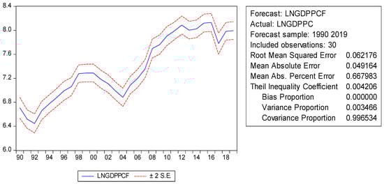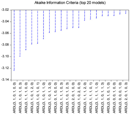 The deceleration order in the ARDL model is chosen according to the Akaike standard (AIC) or the Schwarz Bayesian criterion (SBC) before the specified model is evaluated by the OLS method for serial or autocorrelation in random errors. Pesaran and Shin (2009) recommended choosing two slowdown periods as the maximum annual data [65]. In the third stage, the ARDL specifications for short-term dynamics can be derived by building the following error correction model (ECM):