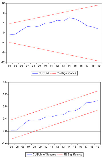 - Pesaran, M.H.; Shin, Y.; Smithc, R.J. Bounds testing approaches to the analysis of level relationships. J. Appl. Econ. 2001, 16, 289–326. [Google Scholar] [CrossRef]