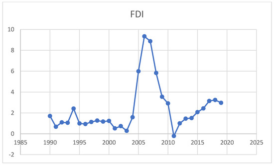 Moving forward in the same context, the concept of foreign direct investment has recently evolved to include not only the transfer of money from one country to another, but also a mixture of financial and intangible assets such as technology, management capabilities, skills, marketing, etc. [6,7]. Hence, attracting foreign direct investment is an intermediate goal that economic policy makers in developing countries, work to achieve as an effective means of job creation, technology transfer, and skills improvement. Therefore, this works to correct labor market imbalances and build new productive capacities, in order to achieve the ultimate goals of the economic policies of growth and economic prosperity. Over the last two decades, foreign direct investment (FDI) funds from developing countries have grown at an annual average higher than those from developed countries, and their outward stock has increased more than 15 percent of the world’s outward stock of FDI compared to less than 10 per cent in the 1990s [8,9]. Globally, foreign direct investment plays an important role in transferring the new technology to the host country and accordingly leads to higher productivity and economic growth. Further, this positive spread came mainly from the interaction of the multinational companies with the local suppliers and customers, as well as from the imitation of technology and knowledge from the local manufacturers competing with these companies. As multinational companies will be concerned with protecting their competitive advantage among enterprises in the same industry, in addition, they are also interested in improving the efficiency and product quality of the suppliers they do business with. Consequently, foreign direct investment affects economic growth and development in a direct way by contributing to the formation of total fixed capital, and indirectly through the channels that constitute external influences related to foreign direct investment [10,11].