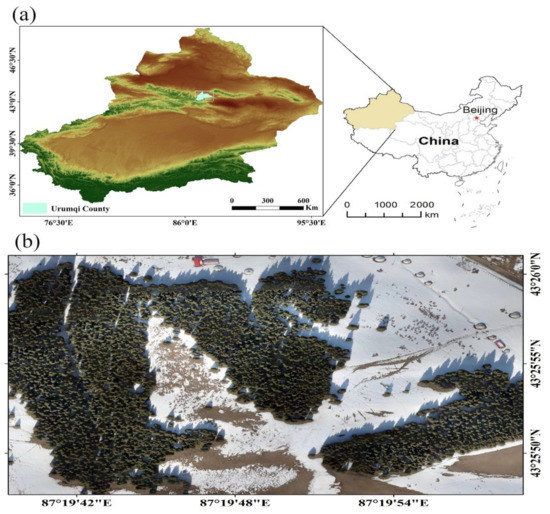 Tianshan spruce forests play an irreplaceable role in water conservation [1], oxygen supply and carbon fixation [2], climate regulation, air purification, nutrient pattern [3], and biodiversity conservation. They also have an important impact on the ecological environment and climate regulation in Xinjiang [4,5]. With the rapid development of tourism, the Tianshan spruce forest at low latitudes on the northern slopes of Tianshan Mountain is vulnerable to anthropogenic deforestation, which could reduce the biomass of Tianshan spruce. Hence, the rapid identification and determination of quantitative statistics are of great significance for understanding and monitoring forest ecosystems.