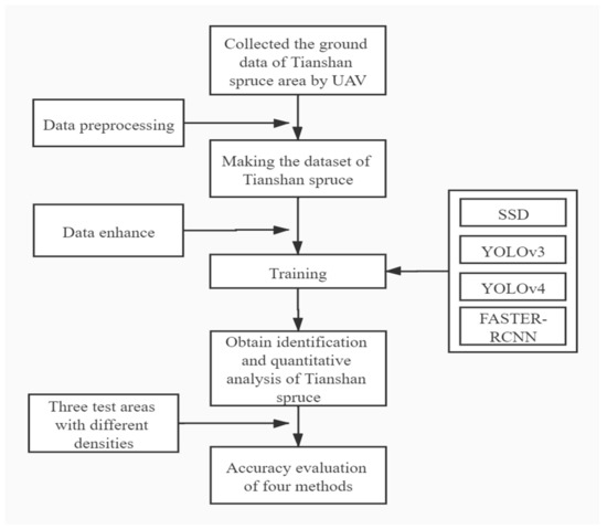 Unlike traditional image classification methods, target detection does not need to extract specific artificial features for particular projects. Instead, training algorithms and different network models are used to learn the advanced semantic information of the image and complete the classification and positioning of the target, thus improving efficiency and accuracy. In this study, SSD, YOLOv3, YOLOv4, and Faster-RCNN were used to detect Tianshan spruce in Yangjuangou in Urumqi County. The most suitable model for spruce detection was selected by comparing their detection effects. Figure 2 is the overall technical route.