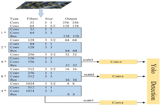 The YOLOv3 [30] (Figure 4) algorithm is an improved algorithm based on YOLOv2. It extends and improves the basic network structure of YOLOv2 from darknet19 (Darknet is an open-source neural network framework). It is fast, easy to install, and supports CPU and GPU computation and adopts the darknet53 network structure. This includes 53 volume layers for image feature extraction. When the deepest feature is extracted, the output and sampling are performed at the same time to fuse with the features at another scale. YOLOv3 combines the construction idea of the Deep Residual Learning for Image Recognition (RESNET) network and adopts a large number of residual blocks, which allows the network structure to be set deeper. This means it has a strong feature extraction ability.