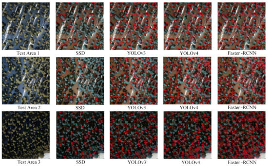 The SSD model had the lowest detection accuracy; its average accuracy over the three different density regions was below 20%. YOLOv3 achieved accuracies of 74.55% and 65.31%. YOLOv4 achieved accuracies of 82.42% and 82.04% in low and medium density regions but only produced accuracies of 41% and 56%, respectively, in the high-density region. The Faster RCNN model had the highest accuracy (96.36%, 96.32%, and 95.54%, respectively). The performances of these algorithms were similar, and their detection accuracies depended on the density of the trees. The accuracies of three algorithms (YOLOv3, YOLOv4, and Faster-RCNN) decreased with the increasing density; however, Faster-RCNN showed the smallest change.