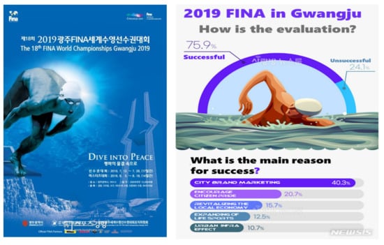 The Fédération Internationale de Natation (FINA) is the international federation recognized by the International Olympic Committee (IOC) for administering international competitions in six aquatics sports. The competition is held every two years, and the latest competition was held from 12 July to 28 July 2019, in Gwangju, South Korea. The 18th Gwangju FINA World Masters Swimming Championships was a joint event held between 5 August and 18 August 2019. However, the next competition was postponed due to COVID-19 and will be held in Japan in 2022 []. Gwangju FINA‘s competition slogan was “Dive in Peace,” which symbolizes the historical value of Gwangju as a sacred place for democratization in South Korea. After successful completion, the Gwangju World Swimming Championships Organizing Committee was officially dissolved on 31 July 2020. As a result of the final settlement of operating expenses, it achieved a surplus of 15.9 billion won (approximately 15 million dollars). According to the “Newsis” survey results [], more than 75% of respondents answered that it was a successful event (See Figure 1), and the most effective area was the city’s brand marketing, followed by the promoting resident pride and the economic effect.