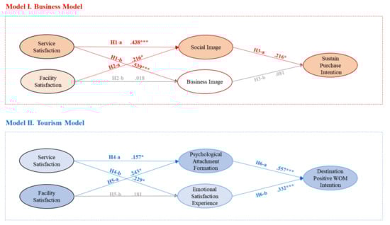 This analysis model is composed of a dual-concept model to simultaneously explain the effect models in two areas. It was conceptualized as a business model (model I) and a tourism model (model II). By reconfiguring the results that can be derived from the hypothesis verification in two paths, the path of the stressed individual effects model is revealed. The conceptually separated model path results are shown in the following figure.