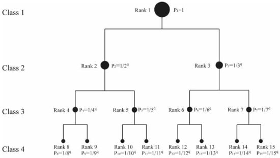 In mathematics, Zipf’s law can be decomposed into a pair of exponential functions through urban hierarchy with a cascade structure model. If we define P1 = 1 unit, then the standard rank-size distribution can be abstracted as a geometric sequence {1/kq}, where k = 1, 2, 3, …. By the 2n rule, this geometric sequence can be divided into M top-down order classes, with 1 city at the first level, 2 cities at the second level, 4 cities at the third level, and 2m−1 cities at the m level (m = 1, 2, …, M, and M can be theoretically infinite) (Figure 1). Thus, we obtain the following exponential functions that represent the generalized 2n rule of the cities [32]: