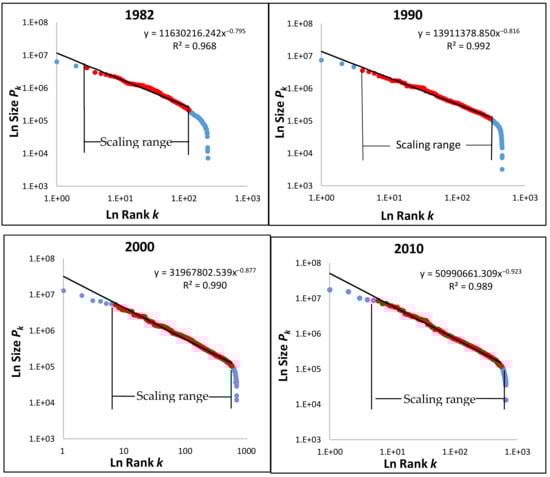 Patterns of hierarchical scaling laws of China’s urban system in 1982, 1990, 2000, and 2010. Source: Chinese Statistical Bureau; 2000 data were drawn from Zhou and Yu [36].