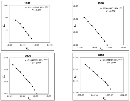 We now proceed to analyze the evolutionary processes of China’s urban system during the selected four years based on the urban hierarchy with a cascade structure model. As previously mentioned, we organize all the cities into a hierarchical system with a cascade structure using the 2n principle. The first class has the largest city, the second class has two cities (second and third largest), the third class has four cities (fourth to seventh largest), and so on. The technique used in the data processing is similar to that of the box-counting method for fractal dimension measurement. The objective of reconstructing the cities by hierarchical scaling is to determine an effective parameter and to show the evolutionary processes of the urban system. Seven classes included 127 cities in 1982. The other years were categorized through analogy. Eight classes included 255 cities in 1990 and nine classes included 511 cities in both 2000 and 2010. For each class, we calculated the average population size Pm and the size ratios rp. Table 1 lists the results. Fitting Equation (5) to the city numbers and city size through the least squares method yields the fractal dimension for each year (Figure 5).