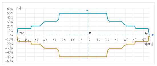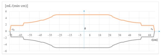 This produces a step function for discrete arguments that expresses the amount of the entire output of the 12 m boom observed over 240 (or 120) sections corresponding to 0.05 m wide grooves (or 0.1 m, respectively). In turn, this allows the integrals in Formulas (1) and (2) to be converted into finite sums for the step function , in which addition includes only indexes (or , respectively). Therefore, the nonlinear objective function obtained, together with the abovementioned linear constraints and boundary conditions, creates a nonlinear optimization model with decision variables. Minimization of such a limited objective function (or its zeroing) can be performed, for example, using the Solver plugin, which is a product of Frontline Systems, Inc. [22] working with an Excel spreadsheet. Then, the precision of calculations requires taking into account the 7° angle, indicated in Figure 1b, at which all nozzles are installed: