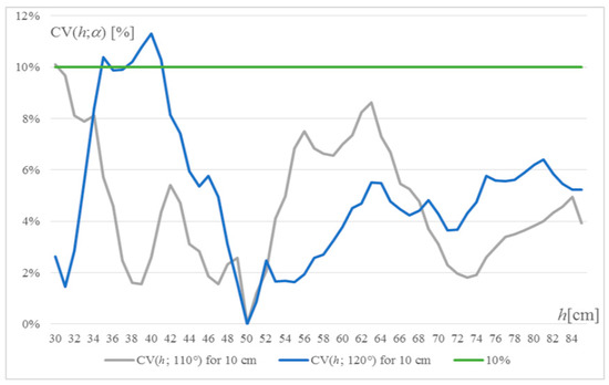 The coefficient of variation CV (h,α) of the efficiency on 10 cm sections of the designed sprayer boom in 1 min is a function of the distance h from the sprayer boom and the spray angle α (Figure 6). For a distance from 30 to 85 cm, the CV is less than 11.3%, and for a distance of 50 cm, it perfectly meets the ISO standard for 50 cm [21].