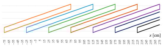 In order to obtain a total homogeneous stream at a distance of h = 0.5 m from the boom, it is necessary to make the insert of each nozzle identical over its entire range measured along the boom. This means that the narrow slit of the nozzle, usually at an angle of 7° to the boom, should be in the form of a parallelogram with angles of (Figure 8). Moreover, for the number of summed homogeneous contributions of k nozzles at a distance of h = 0.5 m from the boom over the entire length to be measured to be the same, the equality , where must be held. Hence . This means that for each of the four types of nozzles with spray angles measured along the boom axis a of 90°, 112.62°, 126.87°, and 136.40°, respectively, at a distance h = 0.5 m from the boom, coming from the efficiency of successive identical nozzles, the probability density functions for uniform distributions on intervals of 1, 1.5, 2, and 2.5 m, respectively, are shifted in relation to each other like nozzles, i.e., every multiple of 0.5 m, which allows them to be added like rectangular bricks obtaining, ignoring the ends of the boom, a long “rectangular wall” (Table 1). Only for k = 5, the range of CV determination should be additionally shortened by 0.5 m on each side. Then, CV = 0 for each of the four above-mentioned. spray angles.