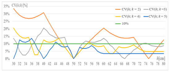 Coefficient of variation CV (h, k) of efficiency on 10 cm boom sections as a function of distance h from the designed parallelogram nozzles D, E, F, and G of the sprayer (i.e., for ).