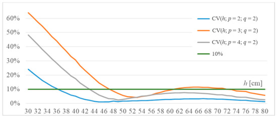 Coefficient of variation CV (h, p, q) of efficiency on 10 cm sections of the boom as a function of the distance h from the designed sprayer boom for parameters (p, q) of glued polynomials.
