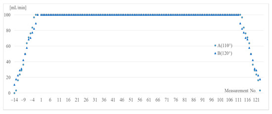 The opening of a slot spray nozzle is a narrow, heterogeneous, almost elliptical slot which produces a single stream with cross-sections the shape of an almost ellipse, as shown in Figure 1b. This oval shape of a single flat stream observed on a dry measuring table at a distance of 0.5 m from the nozzle outlet is mainly due to (1) the designed spray angle α, (2) the opening shape of the slotted sprayer nozzle, and (3) the size of the opening. Hence, all three characteristics affect both the distribution of the liquid flow measured on the measuring table (Figure 2) along the entire length of the larger elliptical axis of a single jet and also the distribution of the liquid flow measured along the entire length of the sprayer boom (Figure 1c). Conversely, the requirement for a uniform spray distribution from the entire sprayer boom fitted with 24 slotted sprayer nozzles with a given spray angle α affects the requirement of the output distribution from a single-slotted spray nozzle and the resulting shape of the nozzle opening and its dimensions. Therefore, for the chosen working pressure and the set spray angle, the shape and dimensions of a small nozzle opening should proportionally correspond to the desired optimal distribution of the flow rate from a single nozzle.