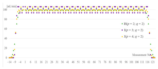 Suboptimal H, I, and J shapes of the stream cross-sections of a group of three nozzles obtained by gluing polynomials with parameters (p, q) and appearing on the measuring table at a distance of 0.5 m from the spray nozzles.