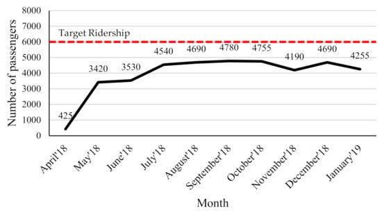 The free bus service in Nibong Tebal was launched in 2018 and has a frequency of 20 min, with operations from 6:00 a.m. to 8:00 p.m. Figure 1 shows the location of Nibong Tebal town and the free bus service route that surrounds residential areas, schools, and higher learning institutions. The state government provides the free bus service in Nibong Tebal to facilitate the mobility of low-income groups and students in this area in order to support the objectives of the Penang Green Agenda. However, the ridership is still not achieving its target. Figure 2 shows the ridership statistics for the free bus service in Nibong Tebal from April 2018 to January 2019.