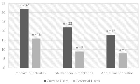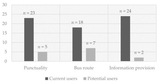 Bus services are important to sustain the development of urban areas, as they provide mobility to different locations via a single transport facility [47] and are considered as a low-cost travel option [48]. Nevertheless, bus services tend to be dismissed due to long waiting times, uncomfortable services, safety issues, and a lack of service information, which call for an assessment on the users’ desired quality from the bus services.