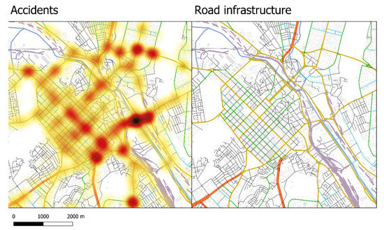 After the city was mapped, then came the collection of other data sources (e.g., socio-demographic and socio-economic data, heat-maps from Strava [16], data collection points, data of road accidents, etc.). The visualization of heat-maps accidents can be found in Figure 6. All the datasets were provided by the municipality, municipality institutions, or by stakeholders.