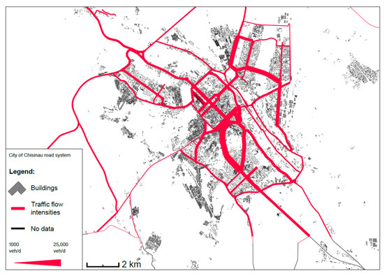 Map of traffic flow volumes in the city (data from automated traffic counters) [17].