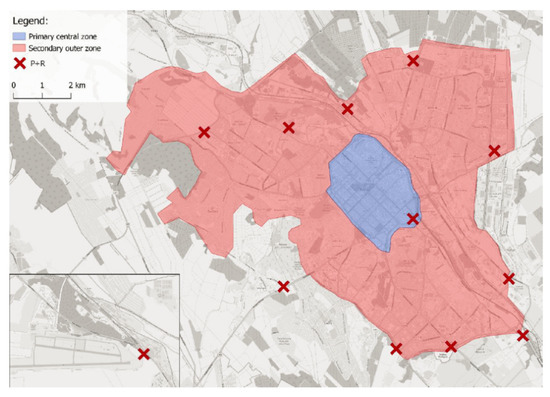 Parking zones and park and ride (P+R) placement map [22].