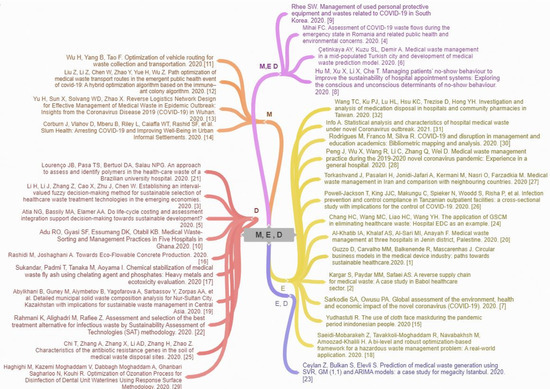 This paper is divided into the following sections, which have been considered key to achieving the proposed objectives. Section 1 is the introduction; Section 2 defines the research method, research questions, and results analysis. Following the scientometric analysis, 32 articles have been selected that deal with the urgent and exciting research directions during COVID-19. Three significant research directions in medical waste were identified, M—Management, E—Exposure, D—Distribution. Section 3 presents discussions on the three approaches, M, E, D. Section 4 develops the paper’s development conclusions.