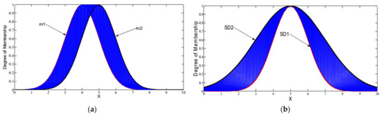 Simple and special kinds of general T2F sets change the same as the interval T2F one. Figure 2 depicts two interval T2F sets. A fuzzy set specified by a Gaussian MF by mean/width ] is demonstrated in Figure 2a. Two T2F sets are given in Figure 2. Figure 2b illustrates a fuzzy set with an MF of Gaussian form encompassing a distinct standard deviation of σ. However, the mean value is quite uncertain and adopts values in the interval of ].