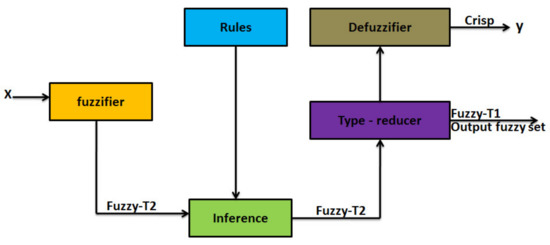 One may gain a certain number by defuzzifying a T1FS [59], whereas T2FS yields a T2F set. This is the reason one has to endeavor to succeed in the reduction in fuzzy set type from two to one in a process entitled “Type Reduction”. The process is a challenging issue of high significance in T2F systems [60]. Figure 3 displays the structure of a T2F system.