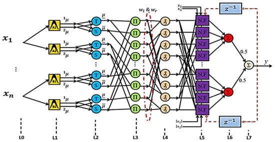 This study recommends a novel NCPRT2FS, of which its total construction is illustrated in Figure 4. As one may see, the system clearly embodies seven layers. Generally speaking, the kth rule would be demonstrated in the following terms in a first-order T2FS with a TSK model by M rules and n inputs: