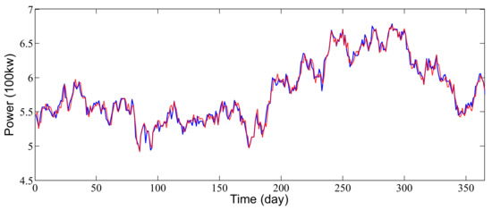 In this example, is wind speed that is fed to the wind turbine system and obtains the 365 samples of , which is the output power of the wind turbine. The other conditions are the same as example 1. Figure 7 exhibits the identification performance of the NCPRT2FS. Here, the output (solid line) and the NCPRT2FS identifier output (dashed line) are shown.