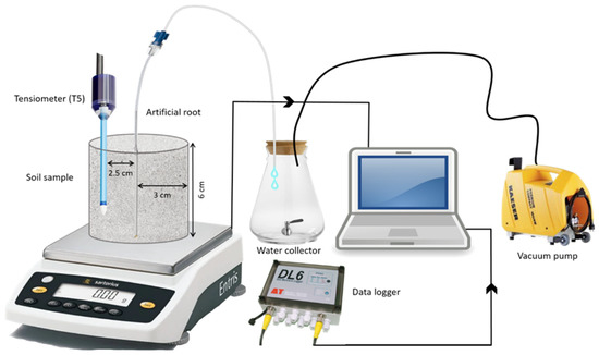 The soil sample was kept on an electronic weight balance. The open end of the porous tube (the artificial root) was connected with a vacuum pump (Kaeser-Kompressor Premium Compact (160/4W), Coburg, Germany) via a beaker. A micro tensiometer (T5, UMS AG, Munich, Germany) was installed at a distance of 2.5 cm away from the artificial rhizosphere. The tensiometer was connected to the data logger to record data. The suction tube and the tensiometer’s wire were fixed firmly so that these may not disturb the weight balance readings. Finally, the weight balance and data logger were connected with a computer to record data. The schematic diagram of the experimental setup is shown in Figure 1.