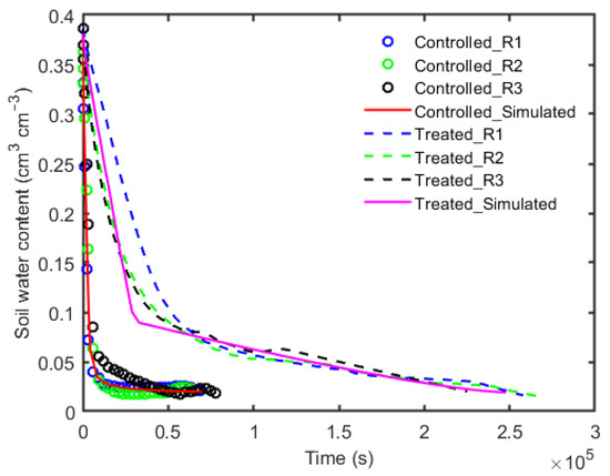The decrease in soil water contents for each replication, for both the controlled and treated samples, along with model fits over time are plotted in Figure 3. The soil water content for each replication was calculated using Equation (1). It can be noticed that as the suction was applied, the water extraction or drop in soil water contents was faster in the controlled scenario as compared to the treated scenario. In contrast, in the treated scenario, due to the presence of the rhizosphere, the decrease in water content over time was rather slower. It is worth noting that almost all added water has been extracted from each scenario. Each best fit was obtained through model simulations for all of the replications in both scenarios. The fitted parameters for Van Genuchten’s equation obtained through the model simulation for both scenarios are listed in Table 3. By comparing the decrease in water content, it can be seen that the controlled and treated scenarios have different trends in the soil drying over time. This indicates that the presence of mucilage in the rhizosphere increased the viscosity of the fluid, and the soil dried out at a slower rate.