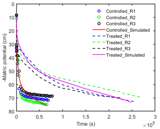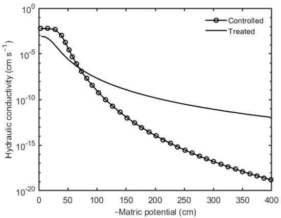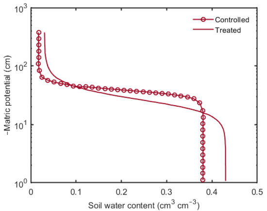 The water retention curves obtained through model simulations for the control and treated scenarios are shown in Figure 6. It can be seen that with an increase in matric potential, the treated scenario started to drain water (at matric potential ≈ 100 cm) before the controlled one. However, as matric potential reached approx. 120 cm, the controlled scenario started to dry and was drained of all water at matric potential of approx. 160 cm. This loss in water in the soils is associated with the air entry value—i.e., the minimum matric potential needed to drain the largest pore in the soil. Figure 6 clearly showed that the air entry value of the treated scenario was lower than the controlled. Although the air entry value of the treated scenario is less, it started to drain water slowly as compared to the controlled one. Moreover, it was observed that the treated scenario had a relatively higher water holding capacity.