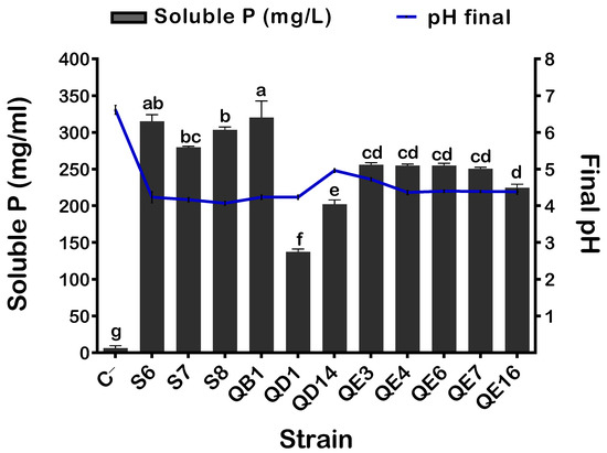 Following the qualitative assay on NBRIP plates, up to 76 single colonies were screened for P solubilization. Based on the solubilization efficiency index, bacteria were grown in NBRIP broth. The quantification of solubilized P in liquid medium allowed us to select 11 isolates named S6, S7, S8, QB1, QD1, QD14, QE3, QE4, QE6, QE7, and QE16. These isolates showed dispersed capacities to solubilize P, varying between 137.33 ± 3.78 and 320 ± 22.62 mg·L−1. The highest concentrations of soluble phosphate were expressed by QB1 (320 ± 22.62 mg·L−1), followed by S6 (315 ± 8.88 mg·L−1), while the lowest was recorded for QD1 (137.33 ± 3.78 mg·L−1) (Figure 1). P solubilization is often accompanied by the acidification of the medium. Thus, we measured the final pH of the culture supernatants. The pH values were negatively correlated to soluble phosphate concentrations (r = −0.84). Maximum pH decline was seen for S8 (4.06 ± 0.05), while the minimal value (4.9 ± 0.05) was recorded for the QD14 isolate.