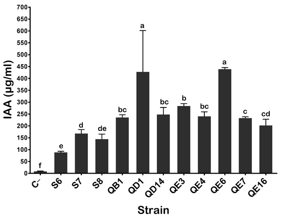 3.2. The QD1 and QE6 Isolates Are the Best IAA Producers