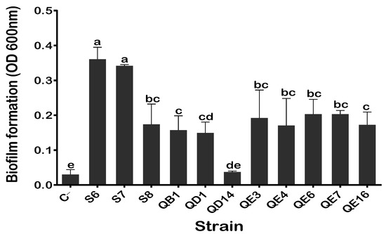 The ability of our PSB isolates to form biofilm was assessed based on the colorimetric assay (see M&M). The values of the OD600nm of S6 (0.36) and S7 (0.34) contrasted with 0.03 measured in the control and in the QD14 isolate. These results indicated strong biofilm formation by S6 and S7. The remaining isolates could be considered as moderate biofilm producers (Figure 3).