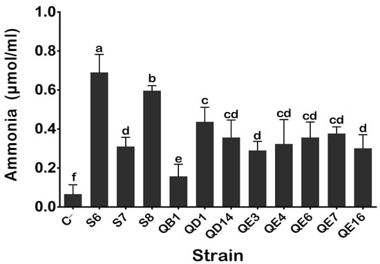 Ammonia and HCN exert various benefits for plants, mainly by acting as metabolic inhibitors against plant pathogens. Our PSB isolates produced ammonia. The highest values were measured for isolates S6 (0.68 μmol·mL−1) and S7 (0.58 μmol·mL−1) (Figure 4). The lowest value was detected in the QB1 isolate (0.15 μmol·mL−1). When tested for the production of HCN, all isolates were positive; however, the most remarkable performance was seen in the S6, QD1, and QE16 isolates (Table 1). Lastly, none of the tested isolates were able to produce either cellulase or proteases.