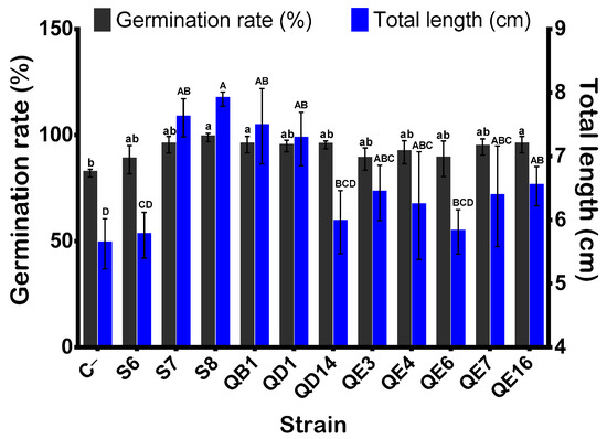 Effect of bacterial inoculation on quinoa seed germination rate and total lengths of seedlings. Germinated seeds and total lengths of seedlings were monitored after 24 h and 5 days of incubation, respectively. The values represent means of replicates (n = 3) ± standard deviations. The letters in superscript indicate the statistically significant difference at 95% between treatments.