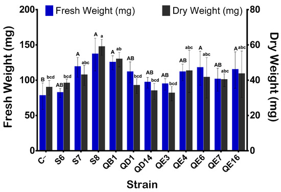 Effect of bacterial inoculation on seedlings biomass. Fresh weights of seedlings were recorded after 5 days of incubation and weights of 48-oven dried seedlings were measured. The values represent means of replicates (n = 3) ± standard deviations. The letters in superscript indicate the statistically significant difference at 95% between treatments.