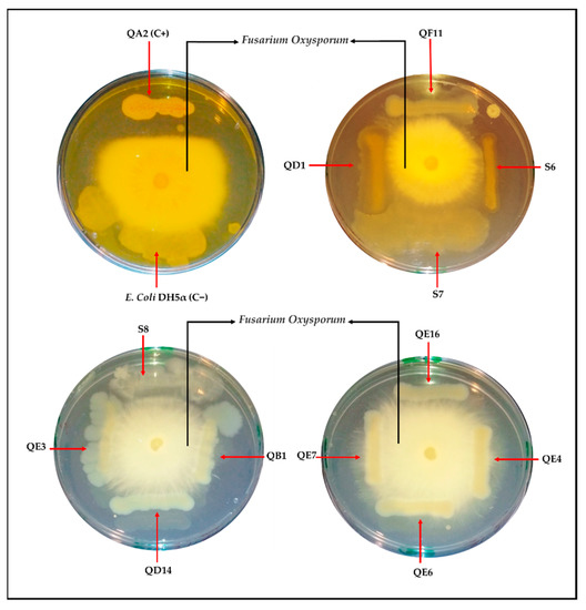 Here, we investigated the anti-fungic activity of the 11 strains using QA2 isolate as a positive control. Three different phenotypes emerged in the presence of Fusarium oxysporum (Figure 8). The first class included strains E. hormaechei subsp. xiangfangensis QE7, E. asburiae QE4, and Enterobacter sp. QE3, with no antagonist effect (no halo formation). The second class included the E. asburiae strains QD14, QB1, and QE6, which exhibited a moderate antagonism effect (Figure 9). The third class included five strains; E. asburiae QE16, P. stutzeri QD1, P. frederiksbergensis S6, Pseudomonas sp. S7, B. atrophaeus GQJK17 S8; all of them induced the formation of halos limiting fungi dissemination. Finally, the aspect of Pseudomonas sp. S7 on the plate was likely associated to its ability to secrete exopolysaccharide (EPS).